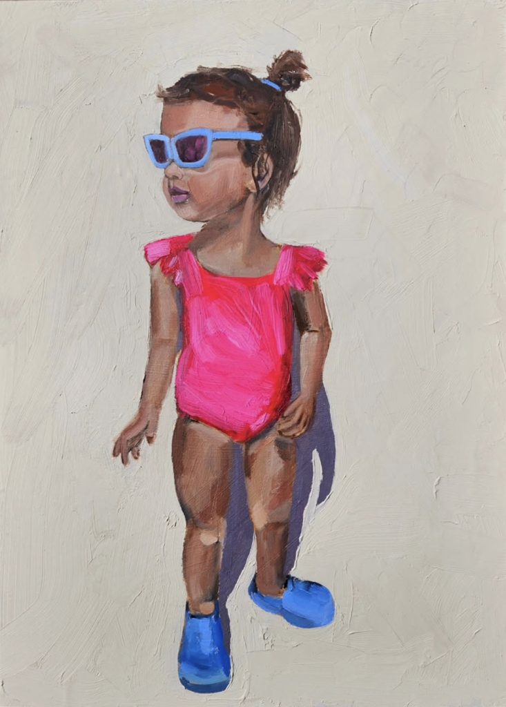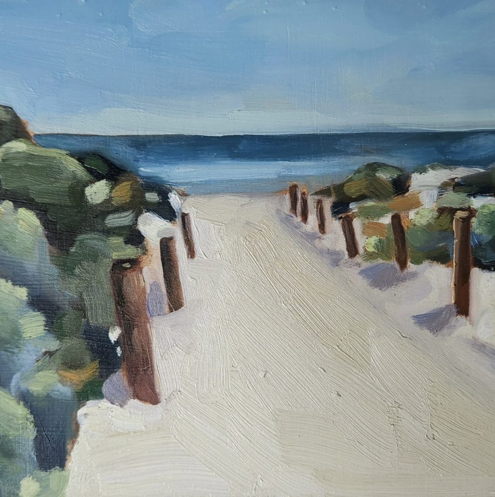 Now, rooted in the coastal communities around Scarborough, WA, Sarah channels the playfulness, energy, and warmth of beach life into her paintings. Her subjects are local — sunlit surf, figures gathered along the shore, marine life glimpsed just beneath the waves, and joyful fragments of summer days. With expressive brushwork and vibrant palettes, she infuses each scene with emotion, presence, and a sense of belonging.